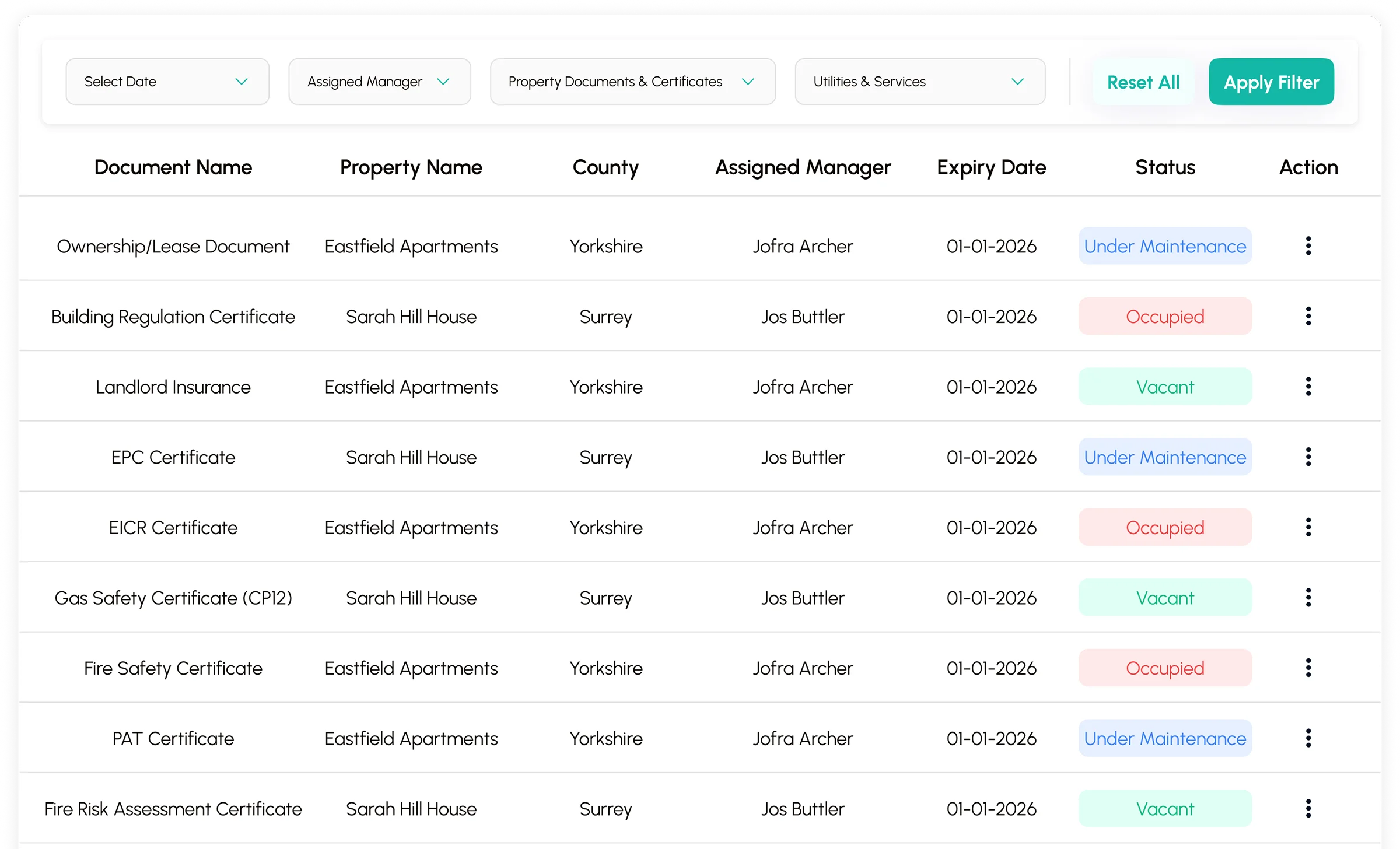 Upload, store, and manage all property documents. Use smart filters to instantly find certificates,